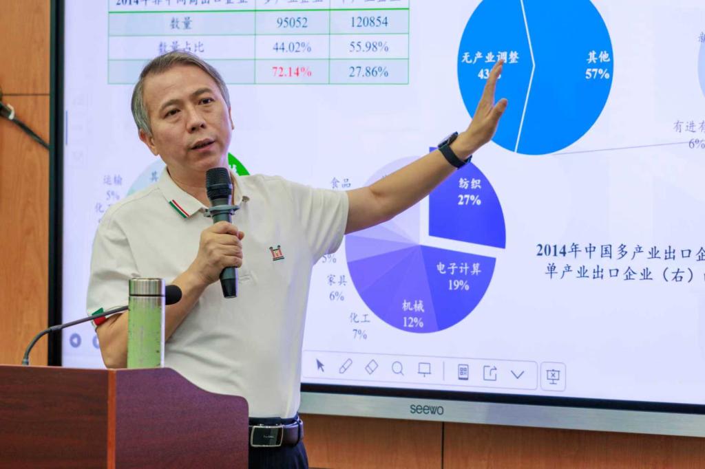黄新飞教授在讲座中指出,在全球贸易格局重塑与“去中国化”暗流下,企业出口多元化绝非盲目跨界,而是围绕核心优势的关联产业延链。数据表明,虽然多产品企业数量占比不足一半,却贡献了超七成贸易额,活力正源于对产品组合的动态调整。随后,黄新飞教授详细介绍了研究模型及其系列结果,并对模型构建和研究结果进行了阐释。