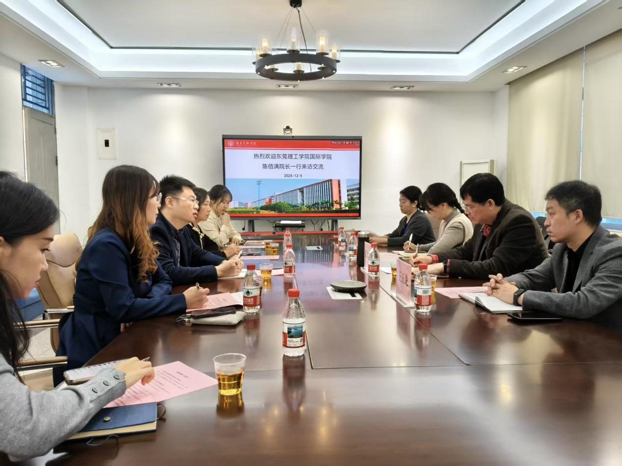 2025年12月5日,东莞理工学院国际学院一行在陈佰满副院长带领下,莅临我校国际教育学院进行深度调研与交流。本次访问旨在围绕新时代高等教育国际化发展的关键议题,共同探讨国际化办学体制机制、资源整合、人才培养等领域的创新实践与优化路径。我校国际教育学院院长张自力、副院长陈茜、教师代表蒋颖和国际交流与合作处科长王玉龙热情接待了来访嘉宾。
