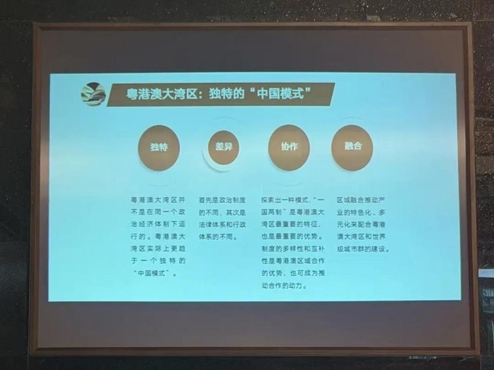 康尧博士首先带领新生深入了解粤港澳大湾区的发展模式,大湾区并非单一政治经济体制运行,政治、法律、行政体系的差异是底色,而“一国两制”下的制度多样性,既成了协作的优势,也成了发展的动力。这份独特性,还靠政策、设施、贸易、资金、社会五大融通落地。