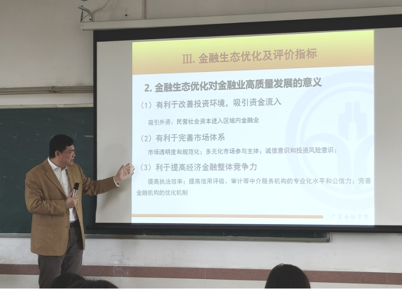 结合当今国际国内形势,张自力阐述了新发展格局的内涵及重要意义,他强调新发展格局是以国内大循环为主体、国内国际双循环相互促进的战略框架,其核心在于依托我国超大规模市场优势,畅通国民经济循环,实现更高水平的自立自强与对外开放。随后他引出了在新发展格局背景下金融生态优化需要重点关注的话题,使同学们进一步加深了对金融生态优化内涵及路径的理解,充分认识到国内金融生态优化对金融业高质量发展的重大意义。